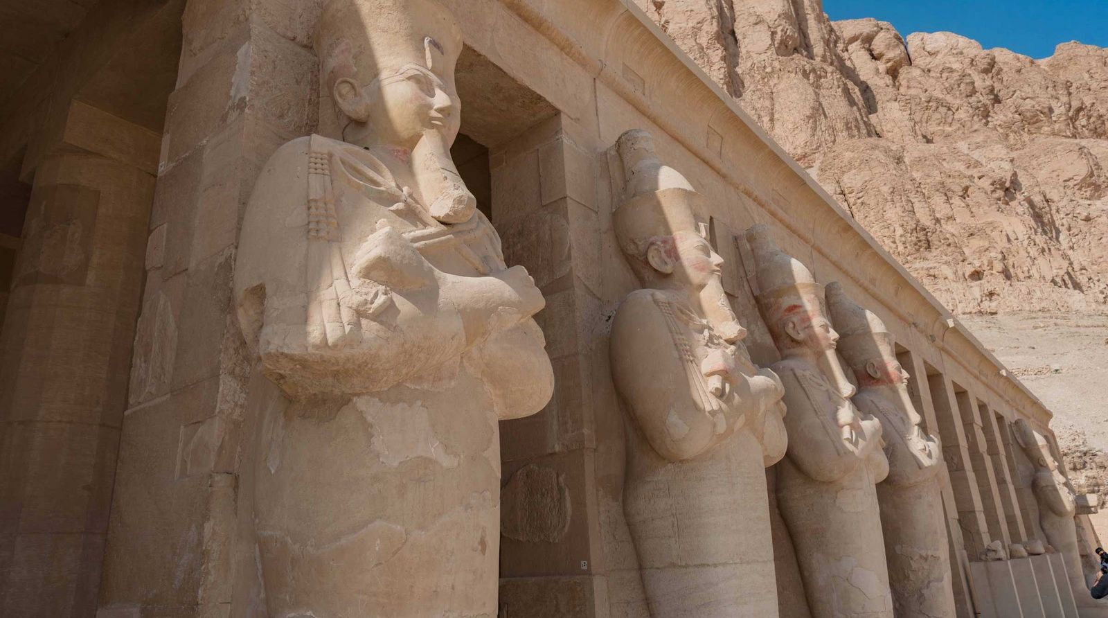 Der Terrassentempel der Hatschepsut in Luxor ist ein faszinierendes architektonisches Meisterwerk im alten Ägypten. Der Tempel wurde im 15. Jahrhundert v. Chr. für die Pharaonin Hatschepsut errichtet und diente als Ort der Verehrung und des Gedenkens an die Götter. Der Tempel befindet sich auf der Westseite des Nils und wurde in eine steile Felswand eingebettet, die durch eine breite Treppe aus dem Tal der Könige zugänglich ist. Der Tempel verfügt über drei Terrassen, die durch Rampen und Treppen verbunden sind und von kolossalen Statuen der Pharaonin flankiert werden. Das Design unterscheidet sich stark von traditionellen ägyptischen Tempeln und vermittelt eine leichte Schwerelosigkeit. Heute ist der Tempel ein beliebtes Touristenziel und ein Beispiel für fortschrittliche Architektur im antiken Ägypten.
