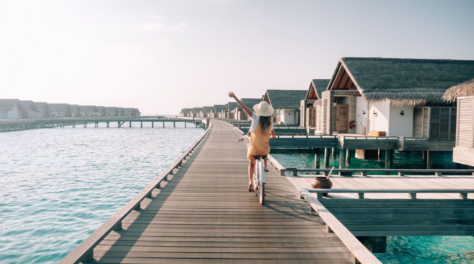 Das Adult-Only Resort mit All Inklusive Konzept hat coole Inklusivleistungen, wie ein Abendessen im Unterwasserrestaurant oder im Food-Truck mit Surf & Turf. Auf mittlerer Höhe des Stegs befindet sich ein Overwater-Gym – dieses darf von beiden Inseln genutzt werden. Bei diesem Ausblick fällt einem das Trainieren gerade zu leicht!