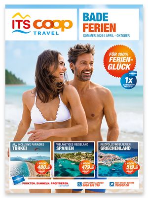 In diesem Prospekt finden Sie beliebte Reiseziele für traumhafte Badeferien im Sommerhalbjahr in Europa und Übersee. Exklusiv bei ITS Coop Travel erhalten Sie pro Reisefranken einen wertvollen Superpunkt gutgeschrieben und profitieren von vielen weiteren Vorteilen. Den neuen Katalog Badeferien Sommer 2026 können Sie hier online durchblättern. Bestellen Sie den Katalog nach Hause oder holen Sie sich Ihr Exemplar in der Coop Filiale.